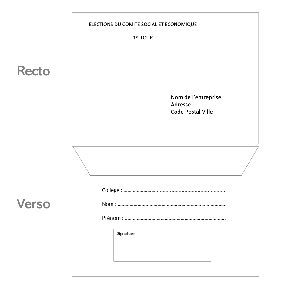 'Nos enveloppes C6 de retour standard sont adaptées au retour de votre vote au "comite social et économique" Choisissez tout simplement le nombre d'enveloppes souhaitées au format C6. Elles seront livrées imprimées avec au recto en haut à gauche les mentions : "ELECTIONS DU COMITE SOCIAL ET ECONOMIQUE" et "1er TOUR", au verso les champs "collège", "nom"...