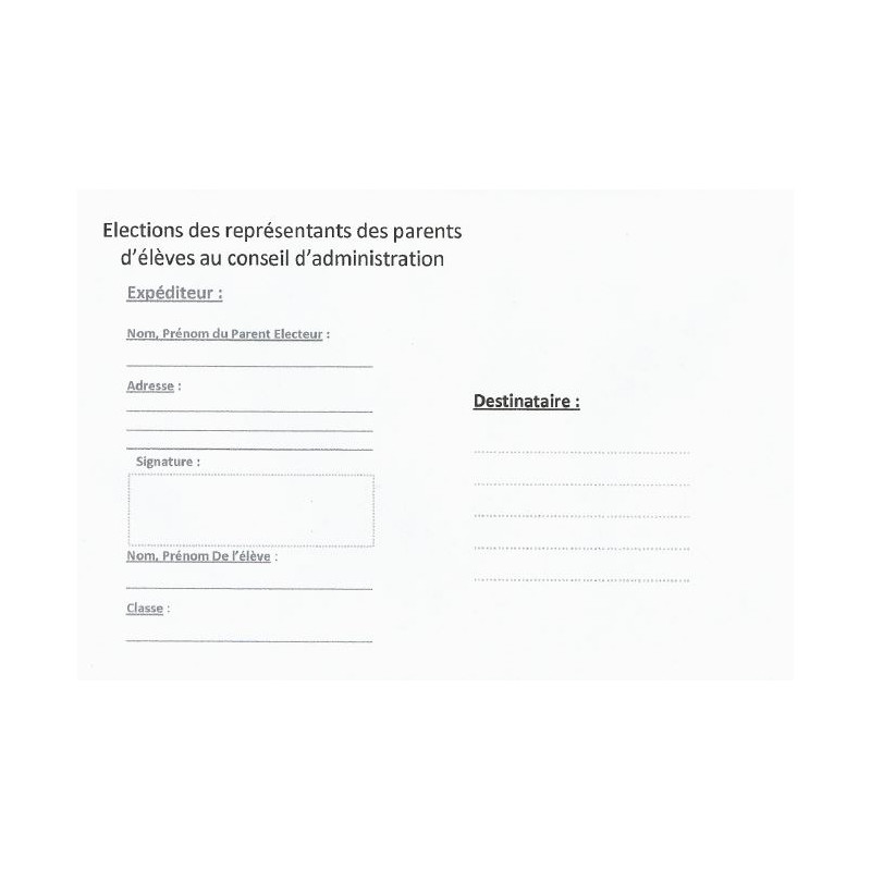 Nos enveloppes blanches 80gr à patte autocollante sont au format 114x162 (C6). Impression avec mention conseil d'administation les informations et signature du parent électeur, les informations enfant et l'espace adresse retour. A associer avec nos bulletins et enveloppes de couleur.